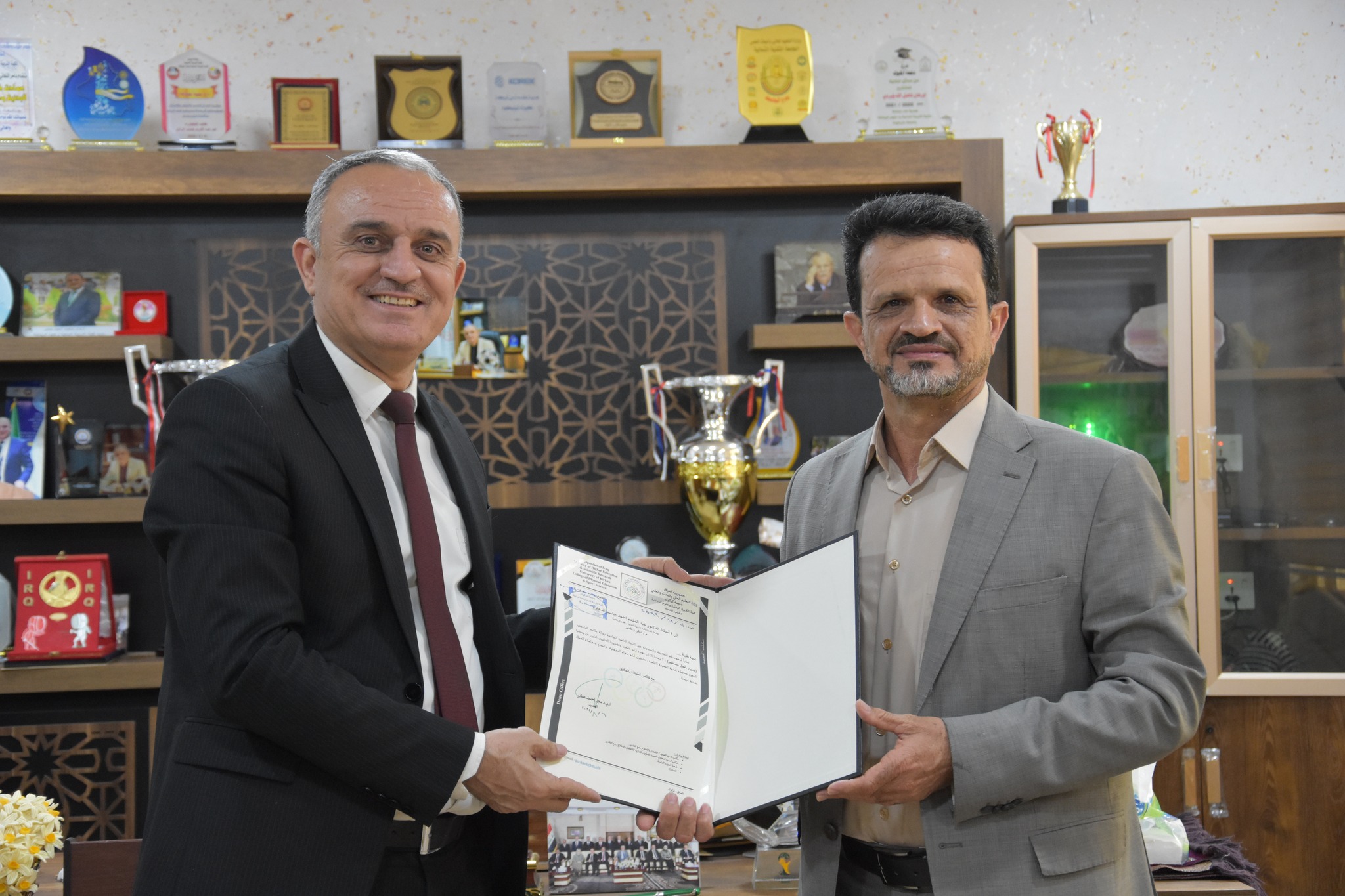 ترأسَ معاون العميد للشؤون العلمية الأستاذ الدكتور عبد المنعم احمد جاسم لجنة مناقشة رسالة طالب الماجستير ( حسين كمال مصطفى ) الموسومة ( الدليل التقويمي للوظائف التنفيذية و حل المشكلات والقابلية على تغيير استراتيجية التنفيذ وبعض القدرات الخاصة لدى الملاكمين ) وذلك في تمام الساعة التاسعة من صباح يوم الثلاثاء الموافق 6 / 8 / 2024 وعلى قاعة مناقشات كلية التربية البدنية وعلوم الرياضة في جامعة كركوك ، حيث تكونت لجنة المناقشة من اسماء السادة ادناه :-