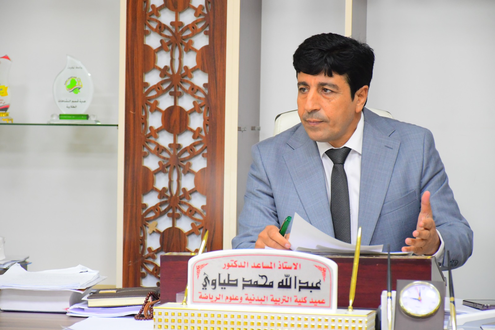 عقد مجلس كلية التربية البدنية وعلوم الرياضة - جامعة تكريت جلسته الخامسة عشر للعام الدراسي 2023 - 2024 يوم الاثنين الموافق 3 / 6 / 2024 ، برئاسة عميد الكلية الاستاذ المساعد الدكتور عبدالله محمد طياوي المحترم وبحضور اعضاء المجلس كافة باستثناء السادة ( أ.د حميد احمد محمد رئيس فرع الالعاب الفردية و أ.م.د سالم خلف فهد رئيس فرع العلوم النظرية و أ.م.د ابراهيم فيصل خلف ممثل التدريسيين ) ، حيث رحب السيد العميد باعضاء مجلس الكلية كافة ، واثنى على جهودهم المبذولة طيلة مدة الامتحانات النهائية للدور الاول للعام الدراسي الحالي 2023 - 2024 وقد ناقش المجلس الفقرات التالية :-