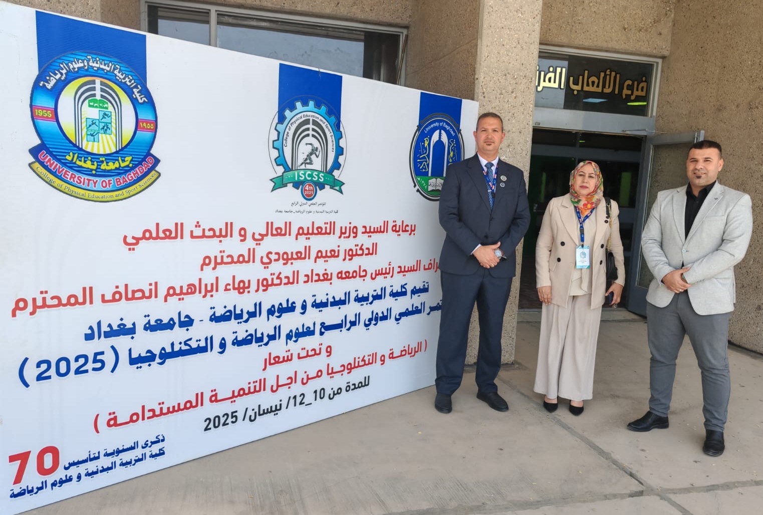 شاركَ الأستاذ الدكتور نكتل مزاحم خليل والأستاذ المساعد الدكتور ندى ابراهيم عبدالرضا والمدرس الدكتور وسام عوني صالح ، في المؤتمر العلمي الدولي الرابع لعلوم الرياضة والتكنلوجيا الذي نظمته كلية التربية البدنية وعلوم الرياضة بجامعة بغداد للمدة من 10 - 12 / 4 / 2025 وتحت شعار ( الرياضة والتكنلوجيا من اجل التنمية المستدامة ) .