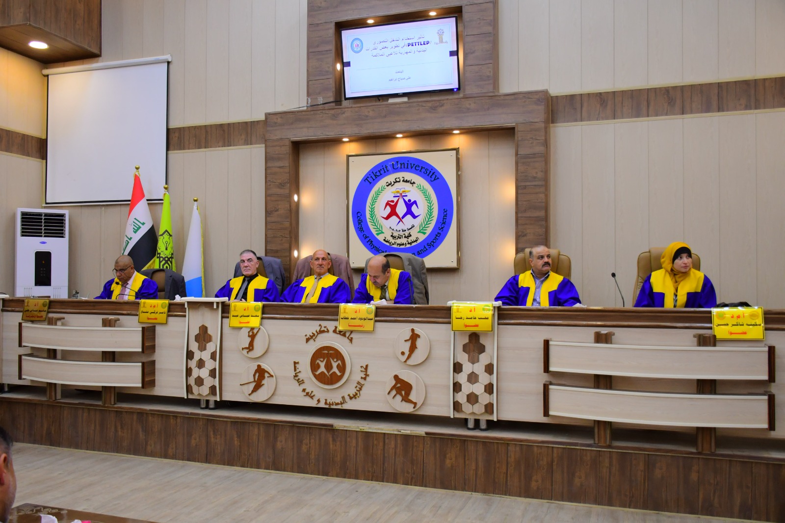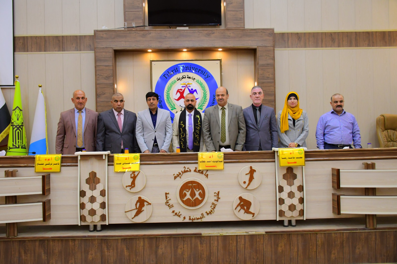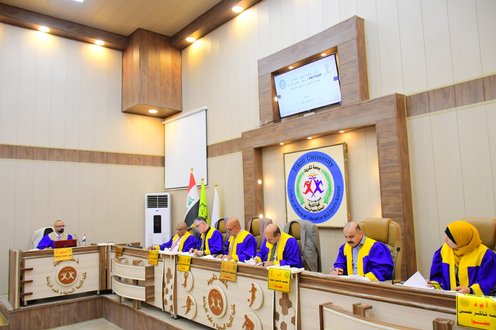 ناقشت كلية التربية البدنية وعلوم الرياضة في جامعة تكريت اطروحة طالب الدكتوراه ( علي صباح ابراهيم ) الموسومة ( تأثير استخدام التداخل التصوري(PETTLEP) في تطوير بعض القدرات البدنية والمهارية للاعبي الملاكمة ) وذلك يوم الاثنين الموافق 2024/5/27 و على قاعة المناقشات الكبرى في كلية التربية البدنية وعلوم الرياضة - جامعة تكريت ، وقد حضر المناقشة عميد الكلية الاستاذ المساعد الدكتور عبدالله محمد طياوي ، وقد أثنى على الجهود المبذولة من قبل الاساتذة المناقشين مثمناً دقة ملاحظاتهم وصوابها والمستوى العلمي الكبير لهذه المناقشات ودورها في تحقيق الرصانة العلمية والمستوى العلمي الذي تطمح وتسعى إليه كليتنا وبما يليق بجامعة تكريت كمنارة وصرح علمي كبير. وتألفت لجنة المناقشة من السادة المدرجة اسمائهم ادناه :