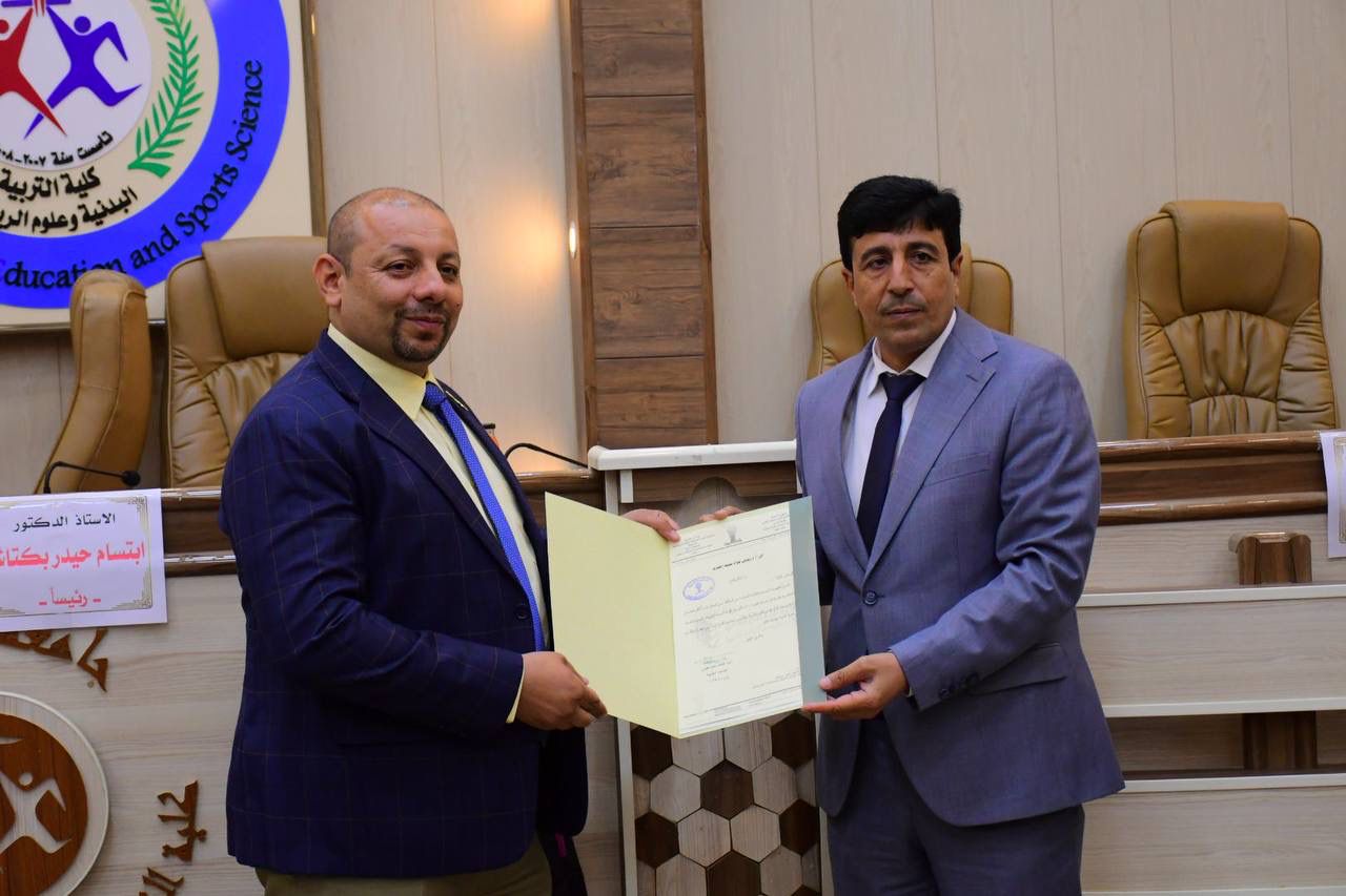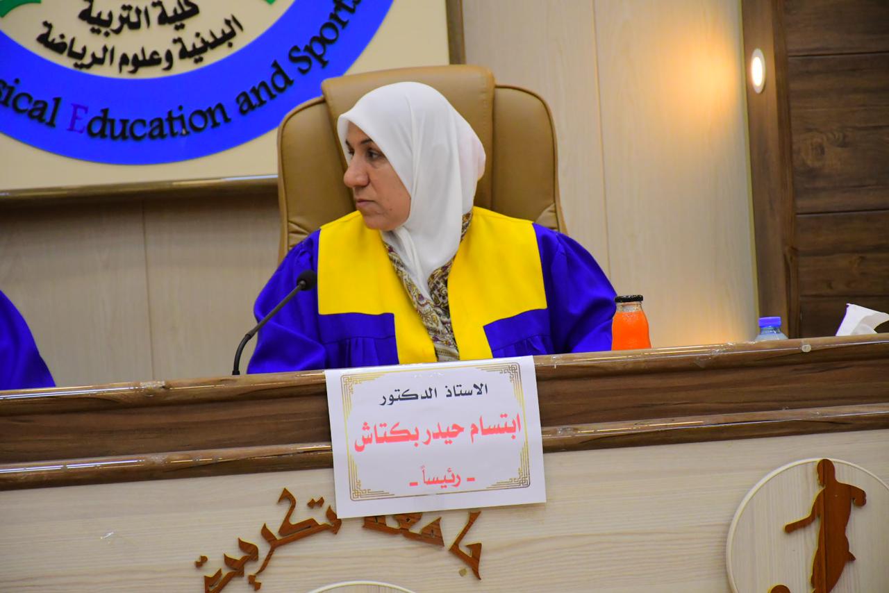 ناقشت كلية التربية البدنية وعلوم الرياضة في جامعة تكريت اطروحة طالب الدكتوراه ( عمر عويد صالح ) الموسومة ( تأثير تدريبات بمقاومات مختلفة بالنافذة العصبية لتطوير بعض القدرات البدنية الخاصة لمراحل أداء انجاز ركض 100 متر للشابات ) وذلك يوم الثلاثاء الموافق 2024/4/30 و على قاعة المناقشات الكبرى في كلية التربية البدنية وعلوم الرياضة - جامعة تكريت ، وقد حضر المناقشة عميد الكلية الاستاذ المساعد الدكتور عبدالله محمد طياوي ، و أثنى على الجهود المبذولة من قبل الاساتذة المناقشين مثمناً دقة ملاحظاتهم وصوابها والمستوى العلمي الكبير لهذه المناقشات ودورها في تحقيق الرصانة العلمية والمستوى العلمي الذي تطمح وتسعى إليه كليتنا وبما يليق بجامعة تكريت كمنارة وصرح علمي كبير. وتألفت لجنة المناقشة من السادة المدرجة اسمائهم ادناه :