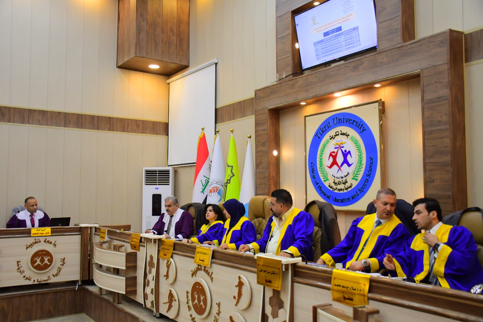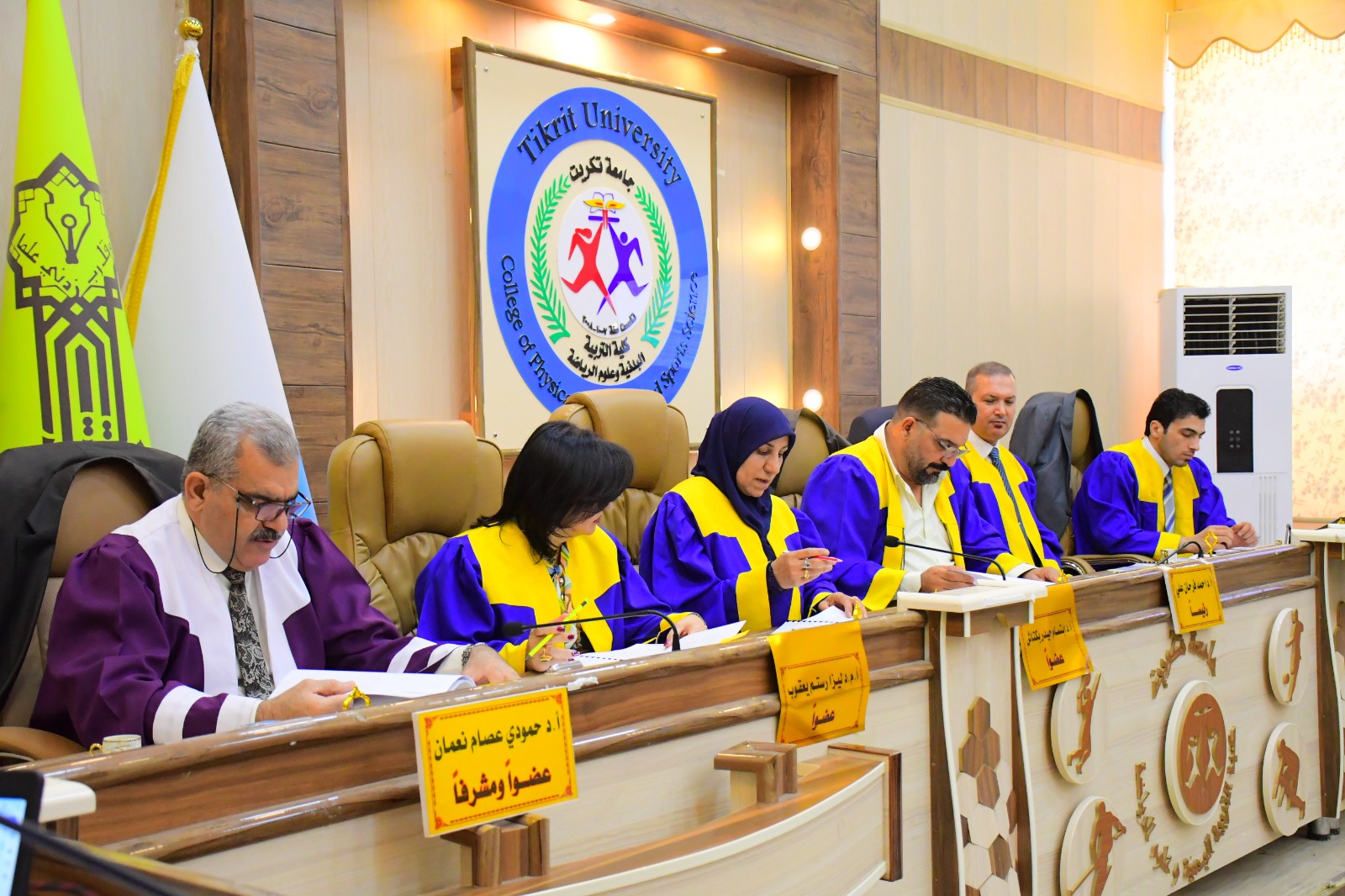 نوقشت في كلية التربية البدنية وعلوم الرياضة بجامعة تكريت اطروحة طالب الدكتوراه ( ثائر جواد كاظم ) الموسومة ( تأثير التدريب بأسلوب " Tabata" في بعض المتغيرات البدنية والمؤشرات الفسيولوجية ومهارات الرمي لمصارعي الجودو دون " 21" سنة ) وذلك في تمام الساعة التاسعة صباحاً من يوم الثلاثاء الموافق 2025/5/6 و على قاعة المناقشات الكبرى في كلية التربية البدنية وعلوم الرياضة بجامعة تكريت ، حيث تألفت لجنة المناقشة من السادة المدرجة اسمائهم ادناه :