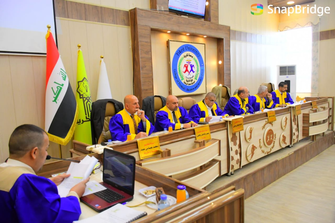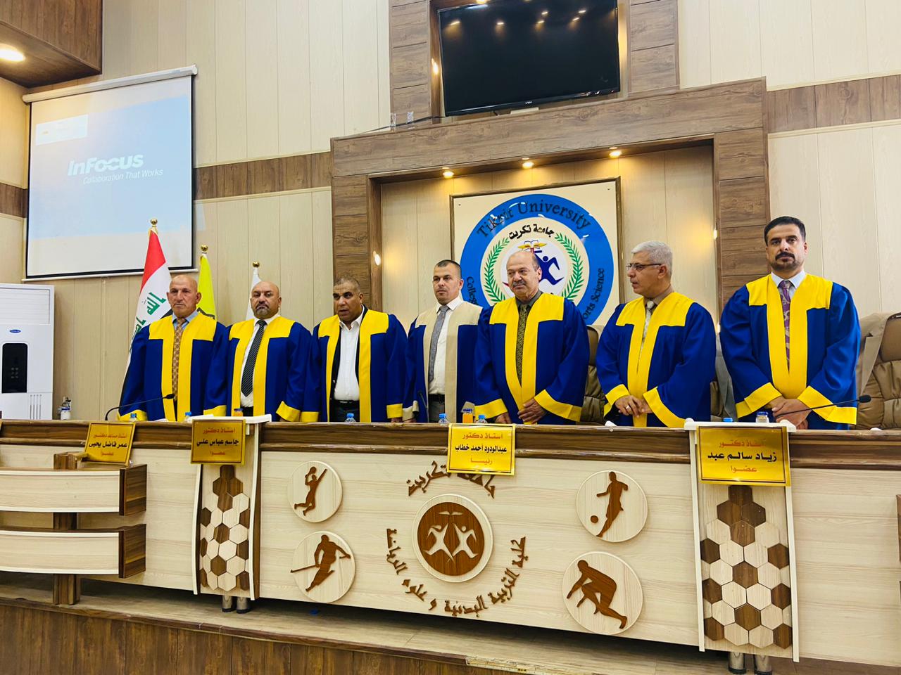 ناقشت كلية التربية البدنية وعلوم الرياضة في جامعة تكريت اطروحة طالب الدكتوراه ( حمود نجم حسن ) الموسومة ( تأثير الحيوية الذاتية في تعزيز القدرات الابتكارية والتوافق النفسي لدى مدرسي التربية الرياضية في محافظة صلاح الدين ) وذلك يوم الاثنين الموافق 2024/4/15 و على قاعة المناقشات الكبرى في كلية التربية البدنية وعلوم الرياضة - جامعة تكريت ، وقد حضر المناقشة عميد الكلية الاستاذ المساعد الدكتور عبدالله محمد طياوي ، وقد أثنى على الجهود المبذولة من قبل الاساتذة المناقشين مثمناً دقة ملاحظاتهم وصوابها والمستوى العلمي الكبير لهذه المناقشات ودورها في تحقيق الرصانة العلمية والمستوى العلمي الذي تطمح وتسعى إليه كليتنا وبما يليق بجامعة تكريت كمنارة وصرح علمي كبير. وتألفت لجنة المناقشة من السادة المدرجة اسمائهم ادناه :