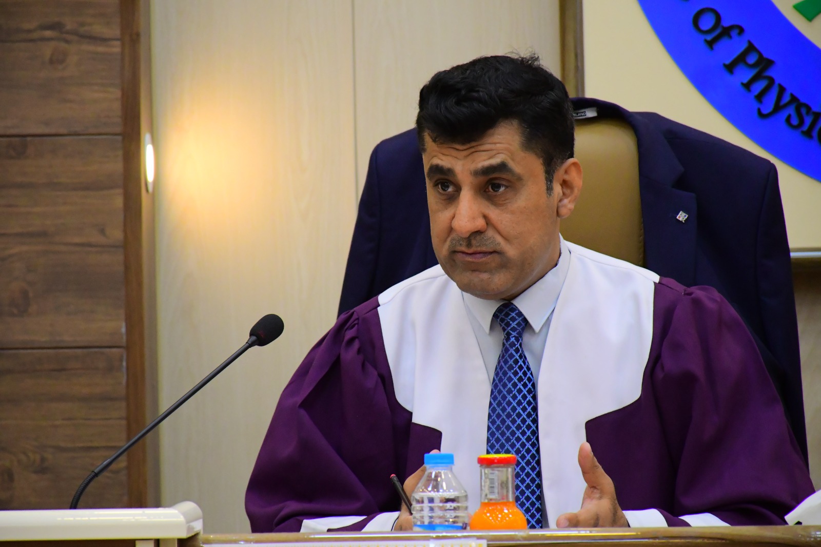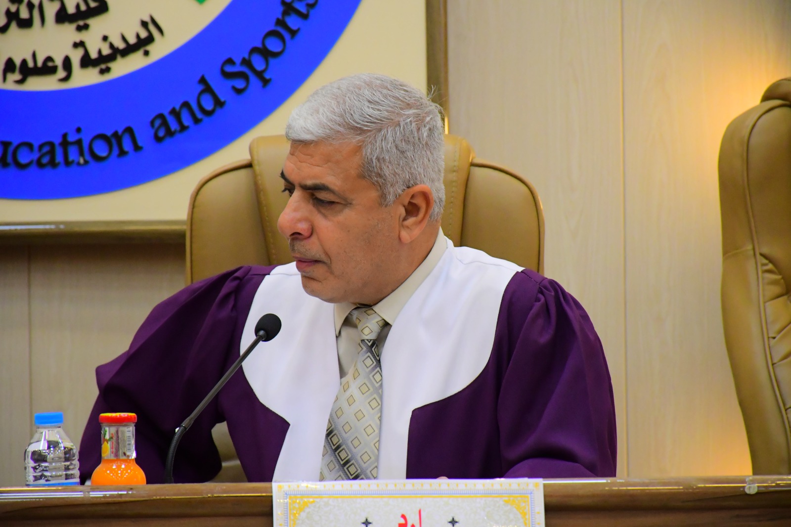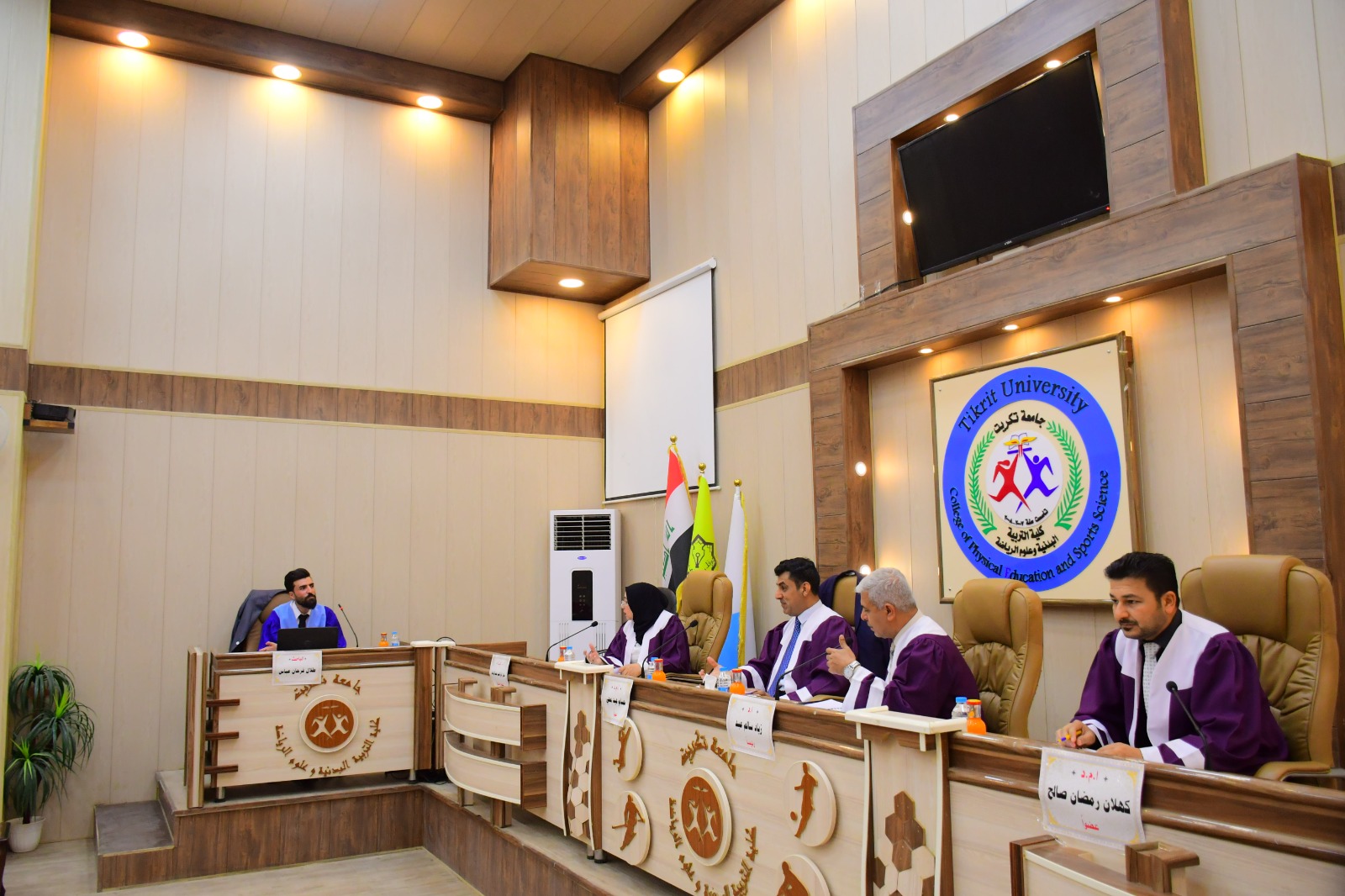نوقشت في كلية التربية البدنية وعلوم الرياضة - جامعة تكريت رسالة طالب الماجستير ( طلال فرحان عباس ) الموسومة ( اثر استراتيجية التسريع المعرفي في التفكير الجانبي والمعرفة القانونية وتعلم عدد من المهارات الاساسية بكرة الصالات ) وذلك يوم الاربعاء الموافق 2024/5/29 و على قاعة المناقشات الكبرى في كلية التربية البدنية وعلوم الرياضة - جامعة تكريت ، وقد حضر المناقشة عميد الكلية الاستاذ المساعد الدكتور عبدالله محمد طياوي ، و أثنى على الجهود المبذولة من قبل الاساتذة المناقشين مثمناً دقة ملاحظاتهم وصوابها والمستوى العلمي الكبير لهذه المناقشات ودورها في تحقيق الرصانة العلمية والمستوى العلمي الذي تطمح وتسعى إليه كليتنا وبما يليق بجامعة تكريت كمنارة وصرح علمي كبير. حيث تألفت لجنة المناقشة من السادة المدرجة اسمائهم ادناه :