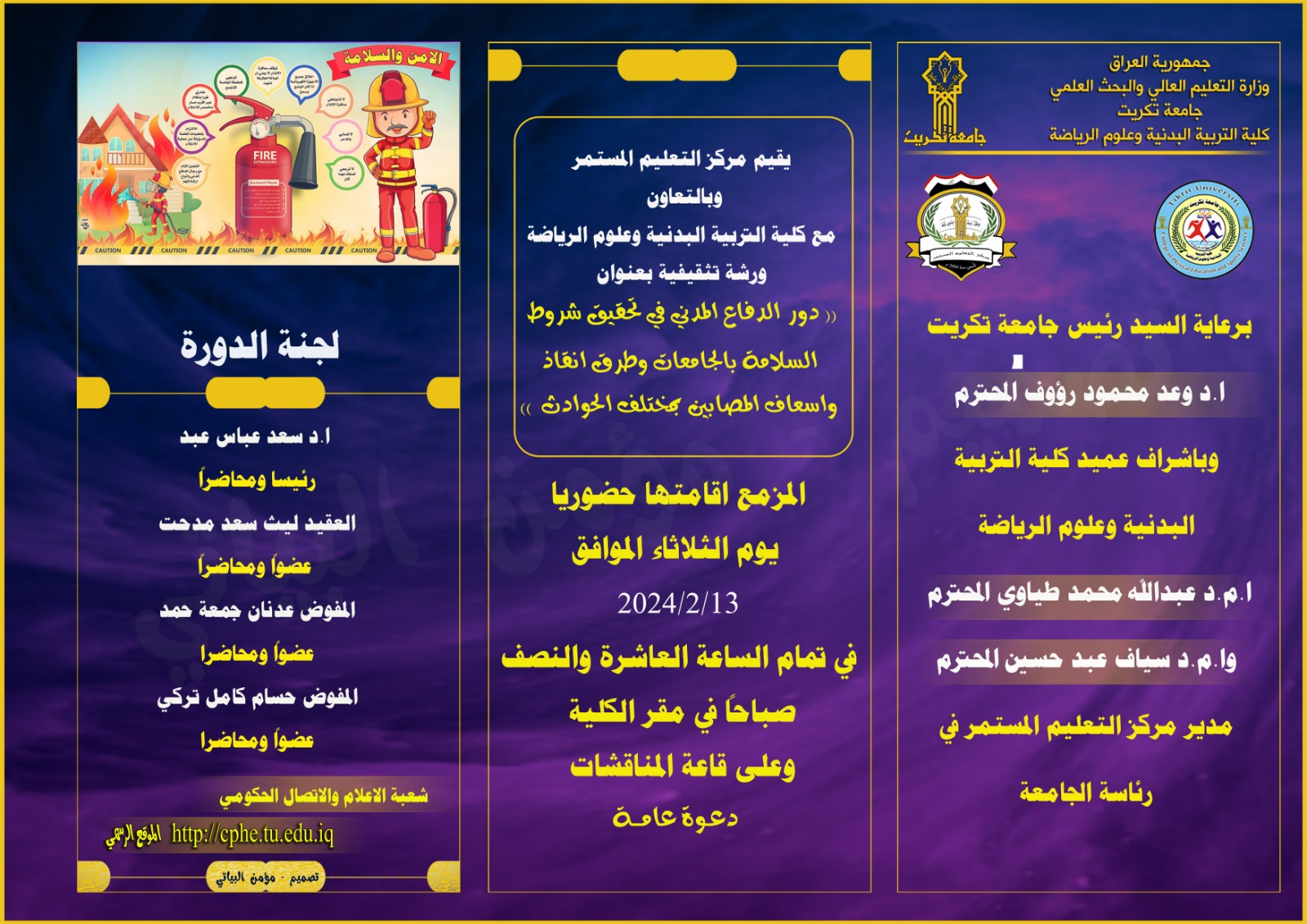 أقامت الشعبة العلمية في عمادة كلية التربية البدنية وعلوم الرياضة بالتعاون مع مركز التعليم المستمر في جامعة تكريت ، ورشة عمل تثقيفية بعنوان ( دور الدفاع المدني في تحقيق شروط السلامة بالجامعات وطرق انقاذ واسعاف المصابين بمختلف الحوادث ) والتي اقيمت حضورياً يوم الثلاثاء الموافق 13 \ 2 \ 2024 في تمام الساعة العاشرة والنصف صباحاً وعلى قاعة المناقشات الكبرى في الكلية ، وتكونت الورشة من جانبين الاول نظري والثاني تطبيقي حيث تم افتعال حريق مسيطر عليه من اجل تعليم طلبة الكلية والحاضرين على طريقة عمل أطفائية الحريق و معرفة انواعها والطريقة الصحيحة لاستخدامها بالاضافة الى الاسعافات الاولية الظرورية لانقاذ المصاب وخصوصاً الاصابات الرياضية والتي ينتج عنها اغماء اللاعب وطرق التصرف الصحيحة مع تلك الحالات ، وتكونت لجنة الورشة من أسماء السادة ادناه :-