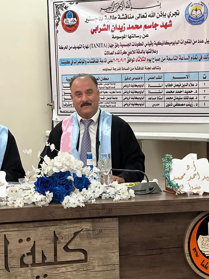 شاركَ السيد معاون العميد للشؤون العلمية الأستاذ الدكتور حميد احمد محمد في عضوية لجنة مناقشة رسالة طالبة الماجستير ( شهد جاسم محمد ) الموسومة ( تحليل عدد من المتغيرات البايوميكانيكية وقياس المكونات الجسمية وفق جهاز (TANITA) لمهارة التهديف من الحركة وعلاقتها بالدقة للاعبي كرة قدم الصالات ) وذلك في تمام الساعة التاسعة من صباح يوم الثلاثاء الموافق 3 / 9 / 2024 وعلى قاعة مناقشات كلية التربية للبنات - قسم التربية البدنية وعلوم الرياضة في جامعة الموصل ، حيث تكونت لجنة المناقشة من اسماء السادة ادناه :-