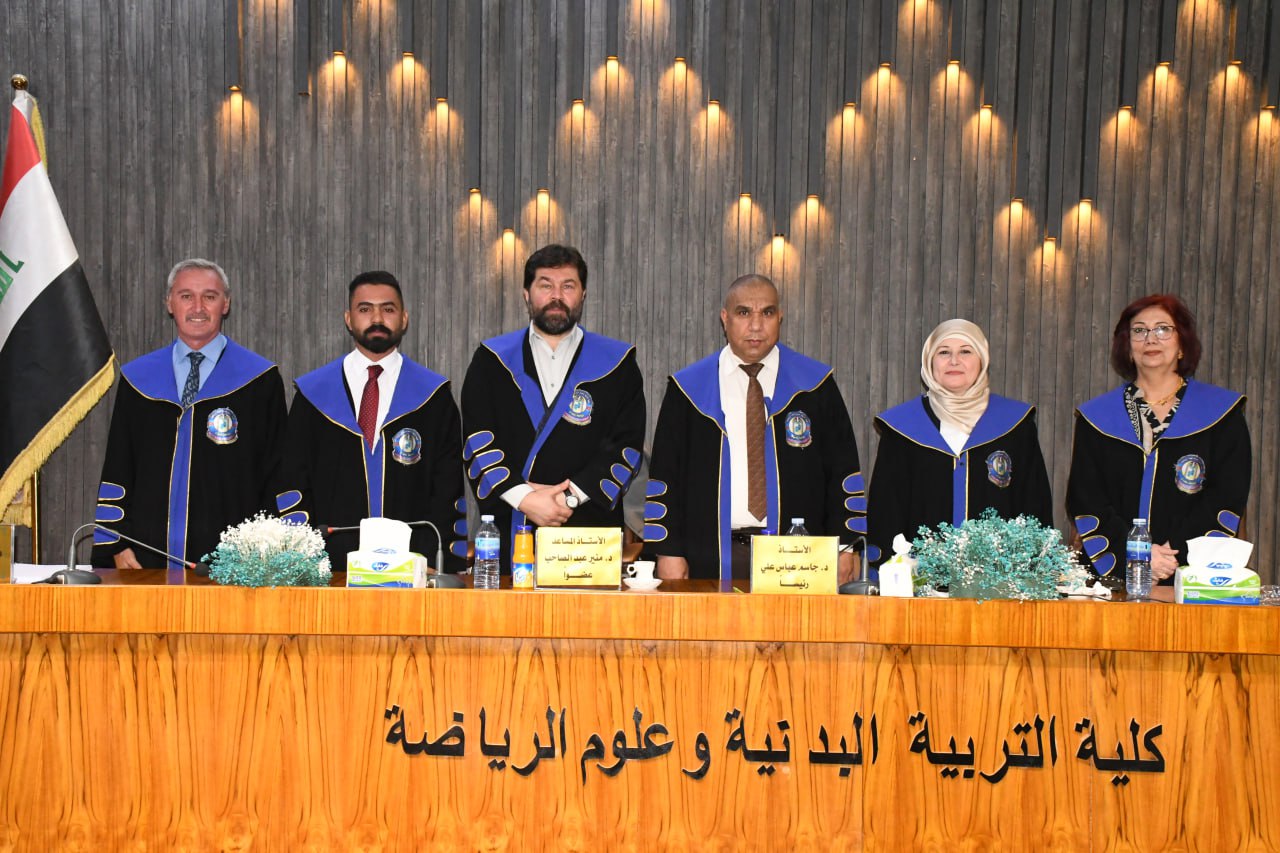 ترأسَ الأستاذ الدكتور جاسم عباس علي لجنة مناقشة رسالة طالب الماجستير ( جهاد كرم علي ) الموسومة ( المناخ النفسي وعلاقته بتماسك الجماعة للاعبي شباب الدوري الممتاز بكرة القدم ) وذلك في تمام الساعة التاسعة من صباح يوم الثلاثاء الموافق 3 / 9 / 2024 وعلى قاعة مناقشات كلية التربية البدنية وعلوم الرياضة في جامعة بغداد ، حيث تكونت لجنة المناقشة من اسماء السادة ادناه :-