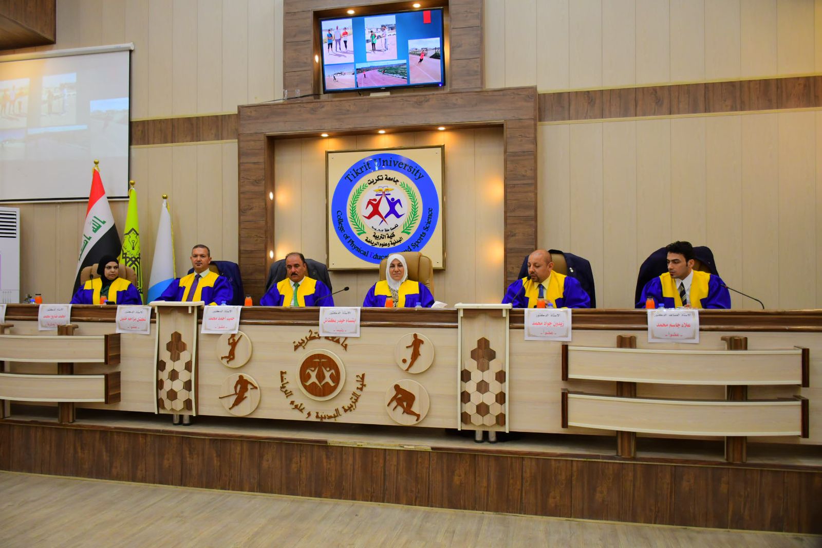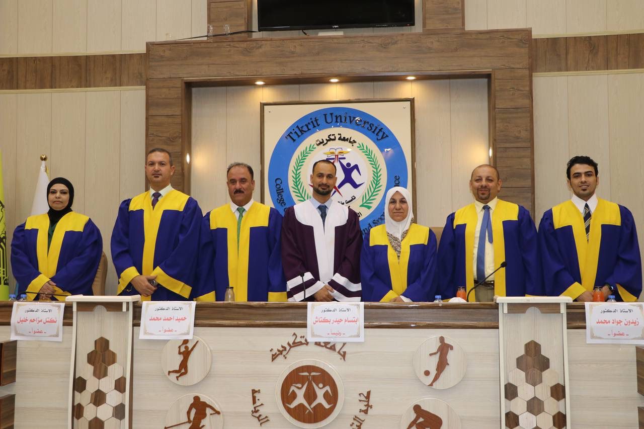 ناقشت كلية التربية البدنية وعلوم الرياضة في جامعة تكريت اطروحة طالب الدكتوراه ( عمر عويد صالح ) الموسومة ( تأثير تدريبات بمقاومات مختلفة بالنافذة العصبية لتطوير بعض القدرات البدنية الخاصة لمراحل أداء انجاز ركض 100 متر للشابات ) وذلك يوم الثلاثاء الموافق 2024/4/30 و على قاعة المناقشات الكبرى في كلية التربية البدنية وعلوم الرياضة - جامعة تكريت ، وقد حضر المناقشة عميد الكلية الاستاذ المساعد الدكتور عبدالله محمد طياوي ، و أثنى على الجهود المبذولة من قبل الاساتذة المناقشين مثمناً دقة ملاحظاتهم وصوابها والمستوى العلمي الكبير لهذه المناقشات ودورها في تحقيق الرصانة العلمية والمستوى العلمي الذي تطمح وتسعى إليه كليتنا وبما يليق بجامعة تكريت كمنارة وصرح علمي كبير. وتألفت لجنة المناقشة من السادة المدرجة اسمائهم ادناه :