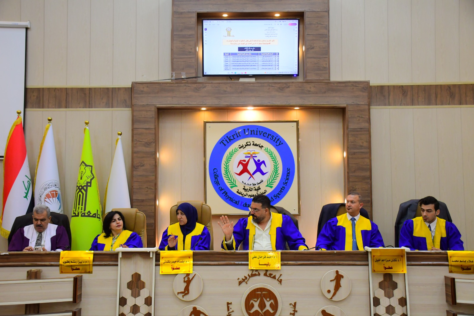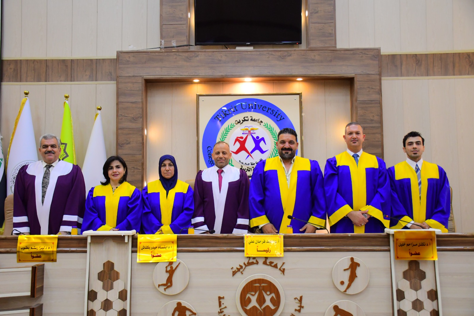 نوقشت في كلية التربية البدنية وعلوم الرياضة بجامعة تكريت اطروحة طالب الدكتوراه ( ثائر جواد كاظم ) الموسومة ( تأثير التدريب بأسلوب " Tabata" في بعض المتغيرات البدنية والمؤشرات الفسيولوجية ومهارات الرمي لمصارعي الجودو دون " 21" سنة ) وذلك في تمام الساعة التاسعة صباحاً من يوم الثلاثاء الموافق 2025/5/6 و على قاعة المناقشات الكبرى في كلية التربية البدنية وعلوم الرياضة بجامعة تكريت ، حيث تألفت لجنة المناقشة من السادة المدرجة اسمائهم ادناه :
