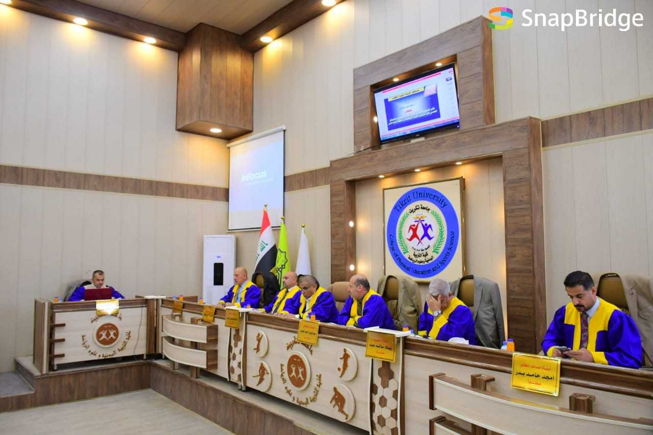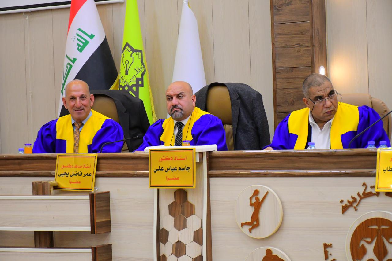 ناقشت كلية التربية البدنية وعلوم الرياضة في جامعة تكريت اطروحة طالب الدكتوراه ( حمود نجم حسن ) الموسومة ( تأثير الحيوية الذاتية في تعزيز القدرات الابتكارية والتوافق النفسي لدى مدرسي التربية الرياضية في محافظة صلاح الدين ) وذلك يوم الاثنين الموافق 2024/4/15 و على قاعة المناقشات الكبرى في كلية التربية البدنية وعلوم الرياضة - جامعة تكريت ، وقد حضر المناقشة عميد الكلية الاستاذ المساعد الدكتور عبدالله محمد طياوي ، وقد أثنى على الجهود المبذولة من قبل الاساتذة المناقشين مثمناً دقة ملاحظاتهم وصوابها والمستوى العلمي الكبير لهذه المناقشات ودورها في تحقيق الرصانة العلمية والمستوى العلمي الذي تطمح وتسعى إليه كليتنا وبما يليق بجامعة تكريت كمنارة وصرح علمي كبير. وتألفت لجنة المناقشة من السادة المدرجة اسمائهم ادناه :