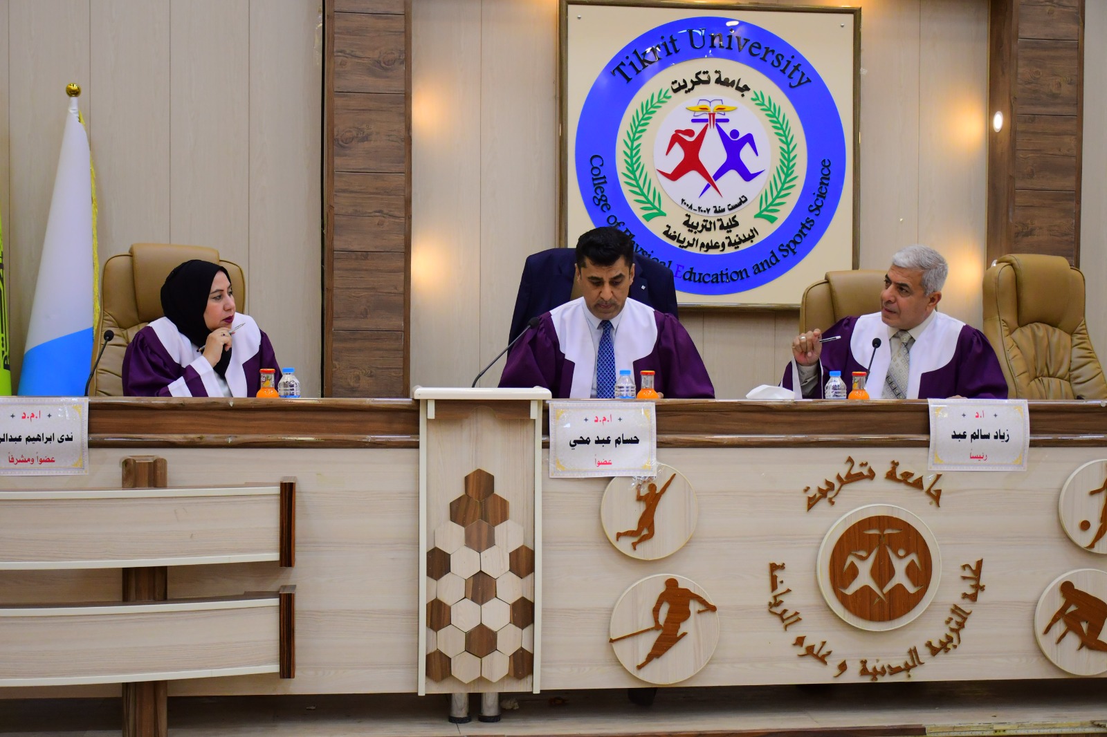 نوقشت في كلية التربية البدنية وعلوم الرياضة - جامعة تكريت رسالة طالب الماجستير ( طلال فرحان عباس ) الموسومة ( اثر استراتيجية التسريع المعرفي في التفكير الجانبي والمعرفة القانونية وتعلم عدد من المهارات الاساسية بكرة الصالات ) وذلك يوم الاربعاء الموافق 2024/5/29 و على قاعة المناقشات الكبرى في كلية التربية البدنية وعلوم الرياضة - جامعة تكريت ، وقد حضر المناقشة عميد الكلية الاستاذ المساعد الدكتور عبدالله محمد طياوي ، و أثنى على الجهود المبذولة من قبل الاساتذة المناقشين مثمناً دقة ملاحظاتهم وصوابها والمستوى العلمي الكبير لهذه المناقشات ودورها في تحقيق الرصانة العلمية والمستوى العلمي الذي تطمح وتسعى إليه كليتنا وبما يليق بجامعة تكريت كمنارة وصرح علمي كبير. حيث تألفت لجنة المناقشة من السادة المدرجة اسمائهم ادناه :