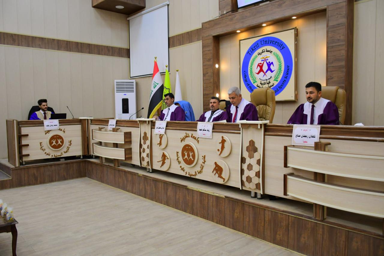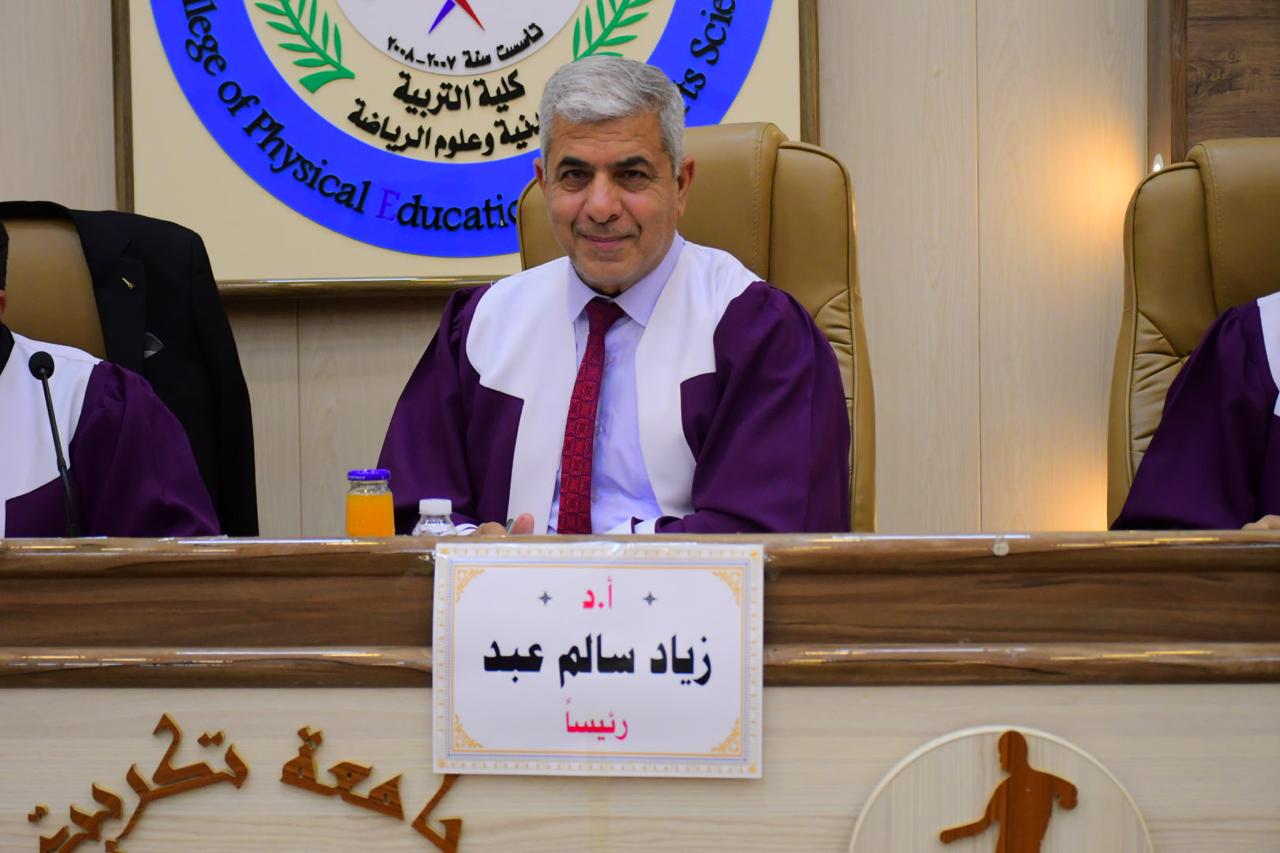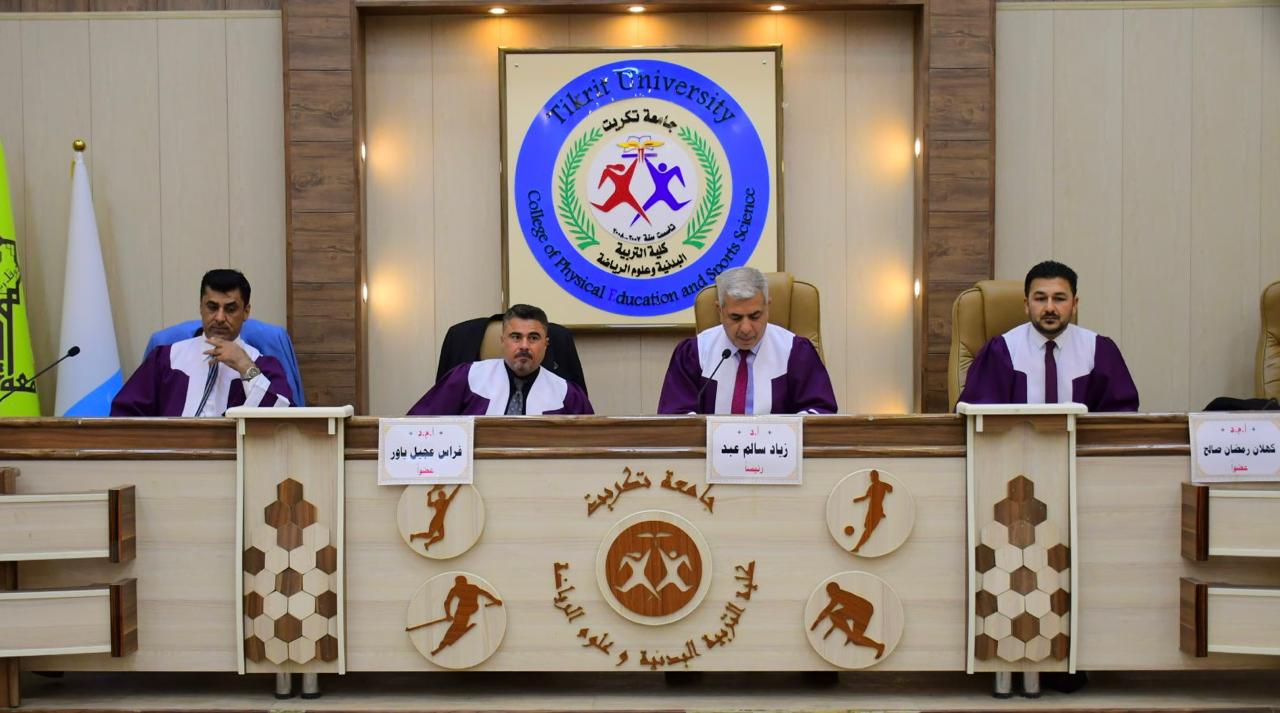 نوقشت في كلية التربية البدنية وعلوم الرياضة - جامعة تكريت رسالة طالب الماجستير ( محمد زيدان خلف ) الموسومة ( أثر نموذج بارمان في تنمية التفكير المحوري وتعلم عدد من المهارات الاساسية بكرة القدم للطلاب ) وذلك يوم الاحد الموافق 2024/6/30 و على قاعة المناقشات الكبرى في كلية التربية البدنية وعلوم الرياضة - جامعة تكريت ، وقد حضر المناقشة رئيس جامعة تكريت الاستاذ الدكتور وعد محمود رؤوف و عميد الكلية الاستاذ المساعد الدكتور عبدالله محمد طياوي ، حيث أثنى السيد رئيس الجامعة على الجهود المبذولة من قبل الاساتذة المناقشين مثمناً دقة ملاحظاتهم وصوابها والمستوى العلمي الكبير لهذه المناقشات ودورها في تحقيق الرصانة العلمية والمستوى العلمي الذي تطمح وتسعى إليه كليتنا وبما يليق بجامعة تكريت كمنارة وصرح علمي كبير. حيث تألفت لجنة المناقشة من السادة المدرجة اسمائهم ادناه :