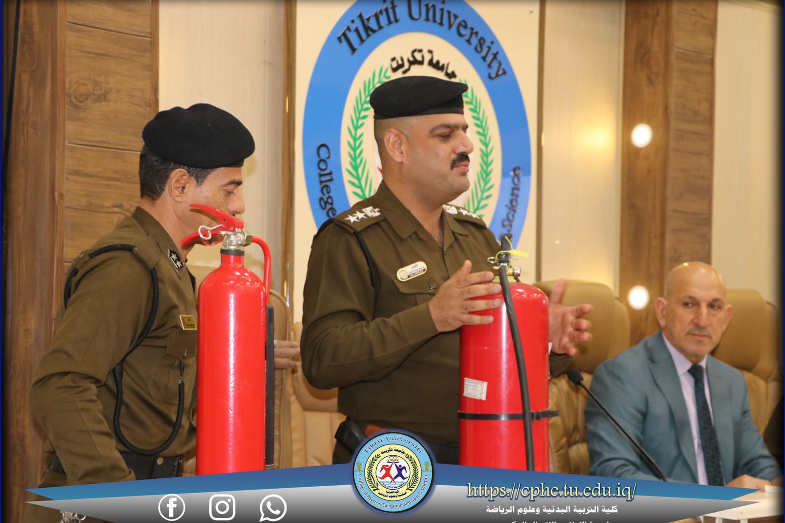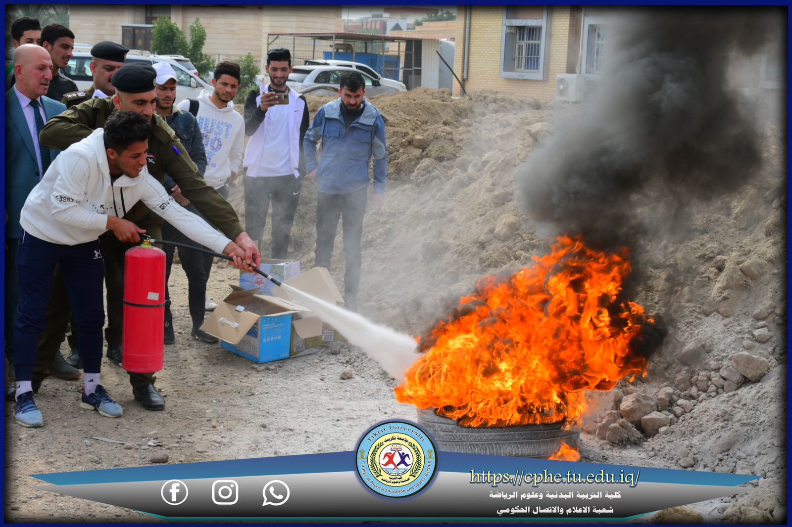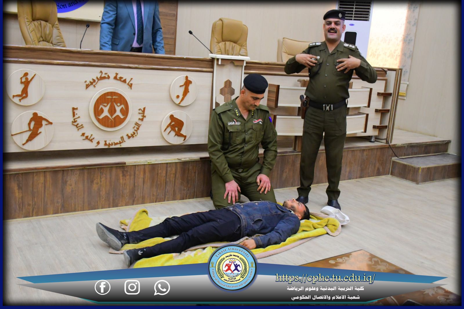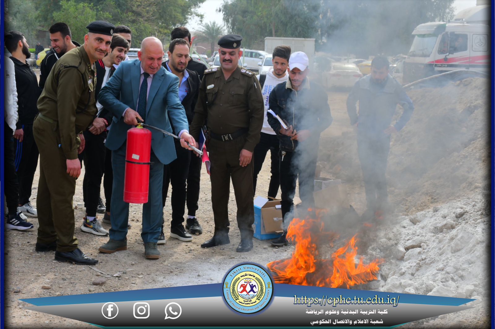 أقامت الشعبة العلمية في عمادة كلية التربية البدنية وعلوم الرياضة بالتعاون مع مركز التعليم المستمر في جامعة تكريت ، ورشة عمل تثقيفية بعنوان ( دور الدفاع المدني في تحقيق شروط السلامة بالجامعات وطرق انقاذ واسعاف المصابين بمختلف الحوادث ) والتي اقيمت حضورياً يوم الثلاثاء الموافق 13 \ 2 \ 2024 في تمام الساعة العاشرة والنصف صباحاً وعلى قاعة المناقشات الكبرى في الكلية ، وتكونت الورشة من جانبين الاول نظري والثاني تطبيقي حيث تم افتعال حريق مسيطر عليه من اجل تعليم طلبة الكلية والحاضرين على طريقة عمل أطفائية الحريق و معرفة انواعها والطريقة الصحيحة لاستخدامها بالاضافة الى الاسعافات الاولية الظرورية لانقاذ المصاب وخصوصاً الاصابات الرياضية والتي ينتج عنها اغماء اللاعب وطرق التصرف الصحيحة مع تلك الحالات ، وتكونت لجنة الورشة من أسماء السادة ادناه :-